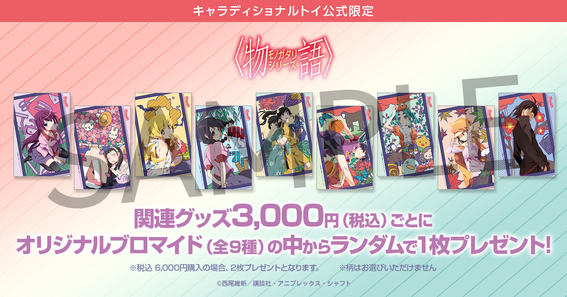 「物語シリーズ」を3,000円(税込)ご予約購入ごとに、オリジナルブロマイド(全9種)をランダムで1点プレゼント!
